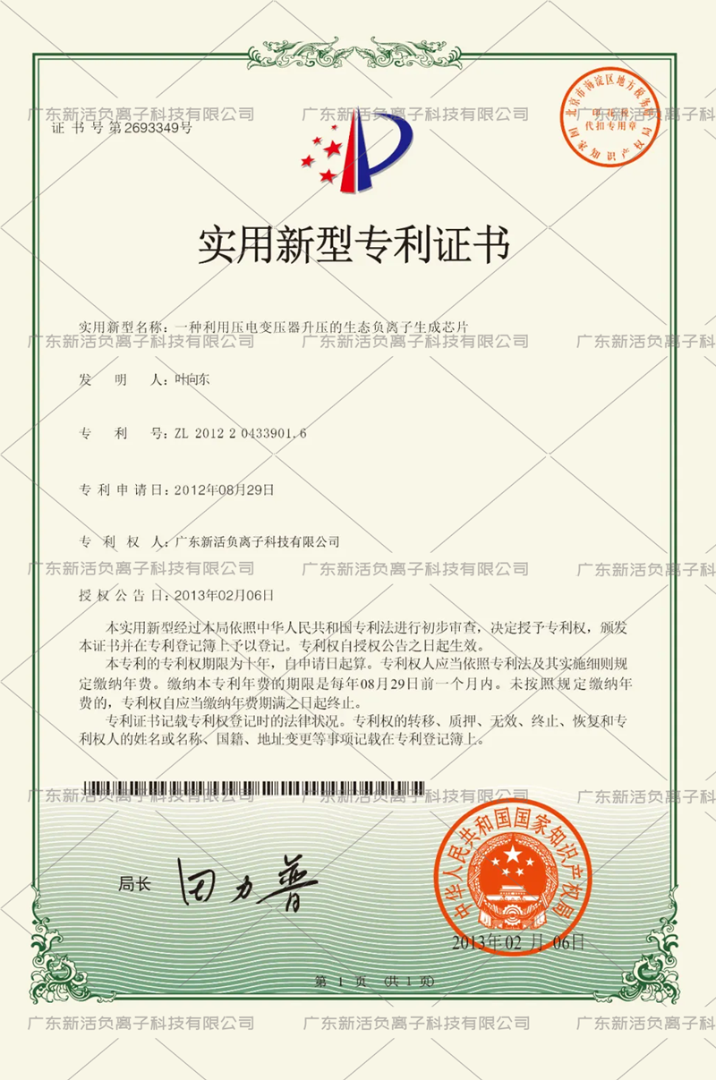 | ZL201220433901.6 | 一種利用壓電變壓器升壓的生態(tài)負(fù)離子生成芯片 |