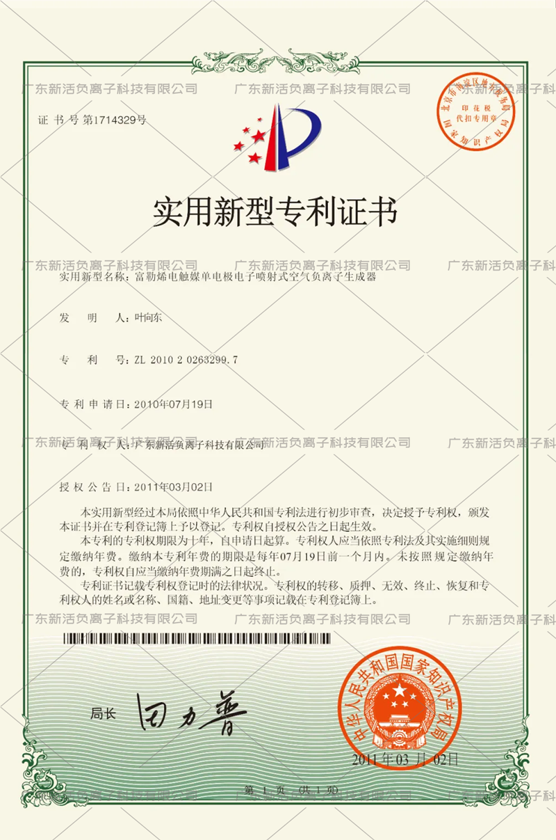 | ZL201020263299.7 | 富勒烯電觸媒單電極電子噴射式空氣負(fù)離子生成器 |